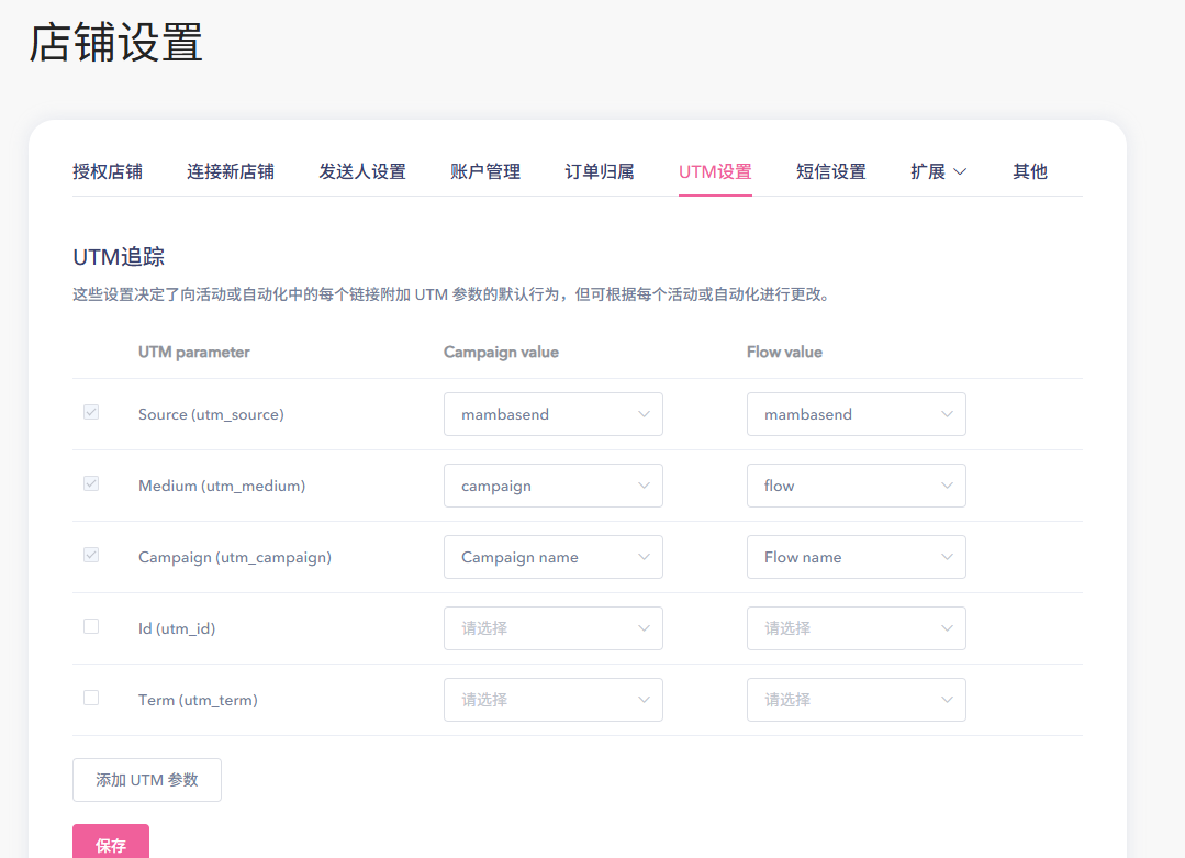 如您内部对渠道的数据统计是看建站平台或者GA,需要使用UTM参数追踪,则需要在这里配置,具体的Value值可以点击下拉进行选择动态或者静态,然后保存